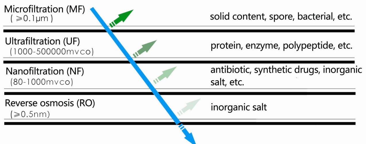 1)Microfiltration (MF): for substances whose cutoff diameter is more than 0.1 um usually as pre-filter of ultrafiltration, nanofiltration, reverse osmosis; large flux and low running cost.
