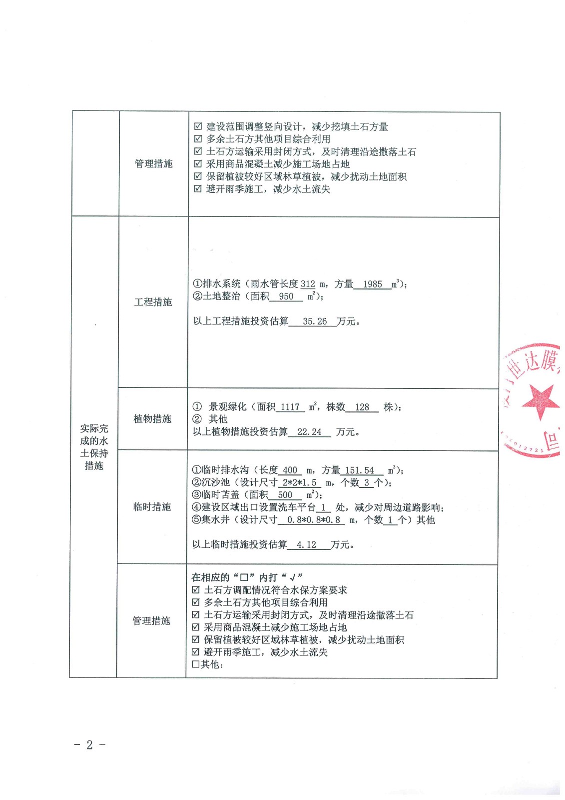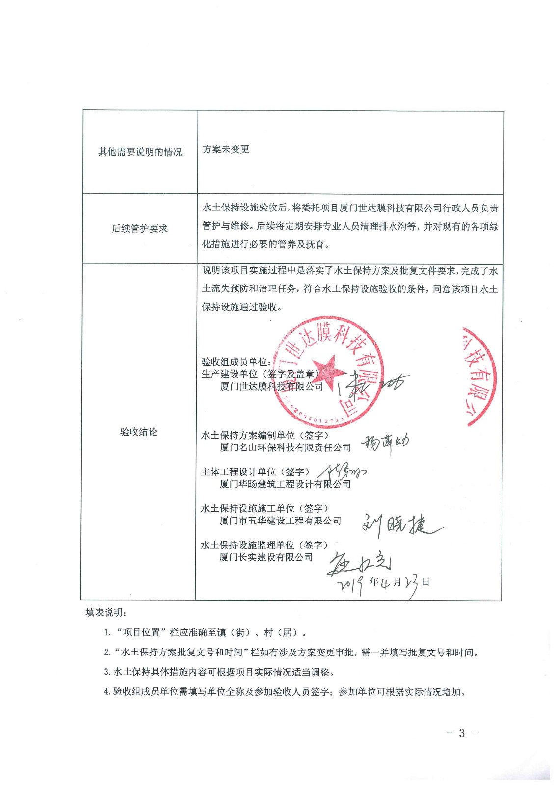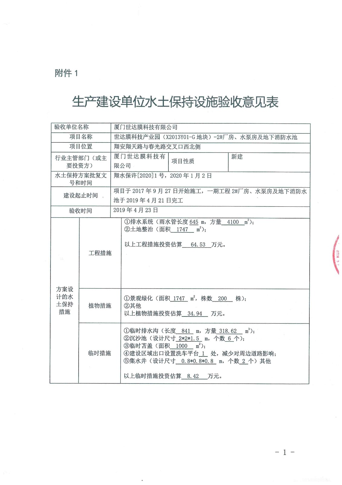由我司建设开发的世达膜科技产业园(X2013Y01-G地块)-2#厂房、水泵房及地下消防水池项目,严格按照水土保持设施验收的要求和程序,于2019年4月23日组织水土保持方案编制单位、主体工程设计单位、施工单位、监理单位等各参建单位开展水土保持设施自主验收会议,并形成《生产建设单位水土保持设施验收意见表》。