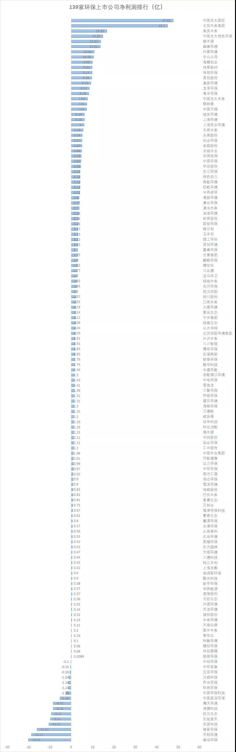 净利润排名前十的企业分别为:光大国际(47.63亿)、北控水务(45.1亿)、重庆水务(16.65亿)、光大绿色环保(14.84亿)、碧水源(13.8亿)、盈峰环境(13.6亿)、兴蓉环境(10.81亿)、中山公用(10.46亿)、海螺创业(9.88亿)、伟星新材(9.83亿)。