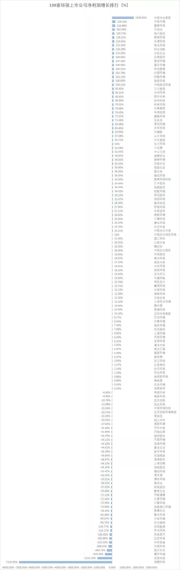 净利润增长排名前十的企业分别为:中国水业集团(1639.65%)、中国天楹(229.34%)、富春环保(216.88%)、万邦达(182.58%)、纳川股份(159.73%)、联泰环保(139.31%)、永清环保(134.04%)、菲达环保(121.5%)、科达洁能(120.28%)、云投生态(114.05%)。