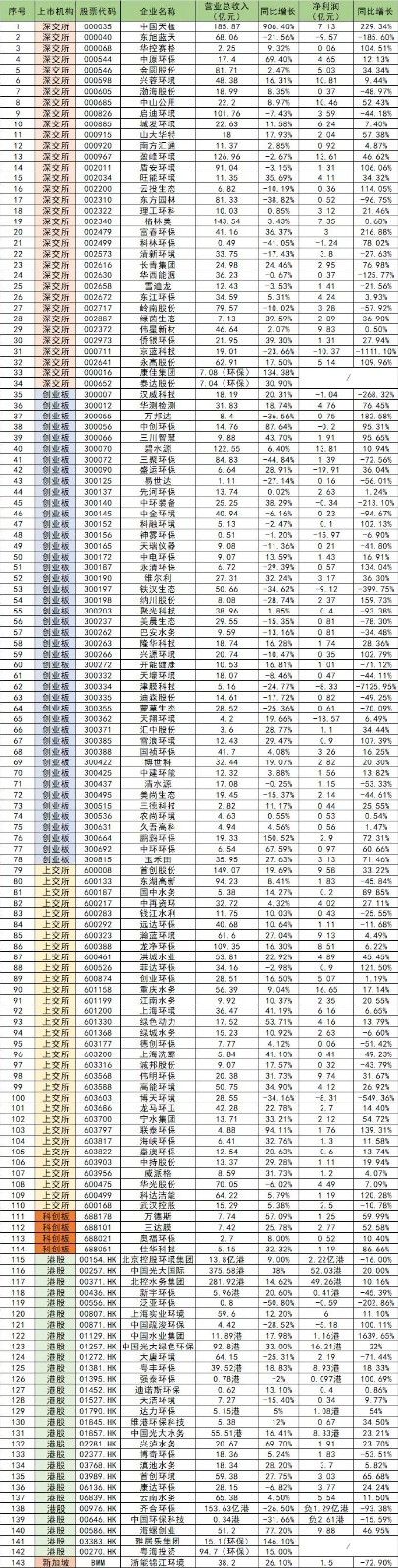 143家涉环保上市公司2019年业绩详细大数据
