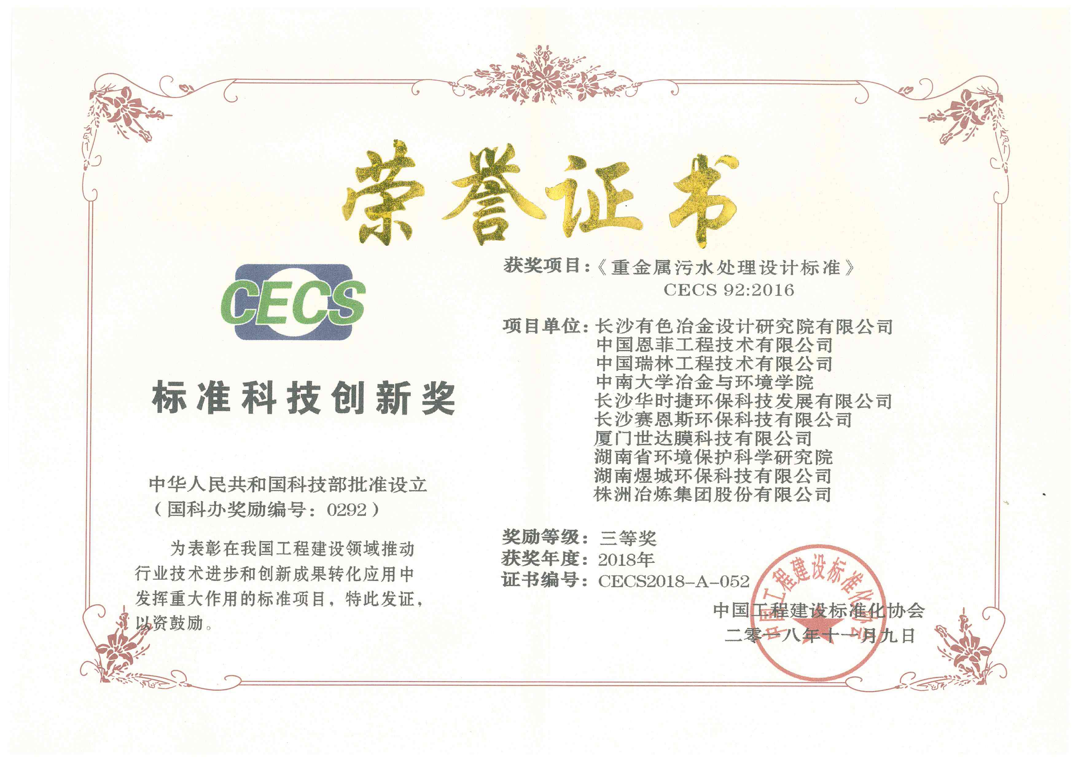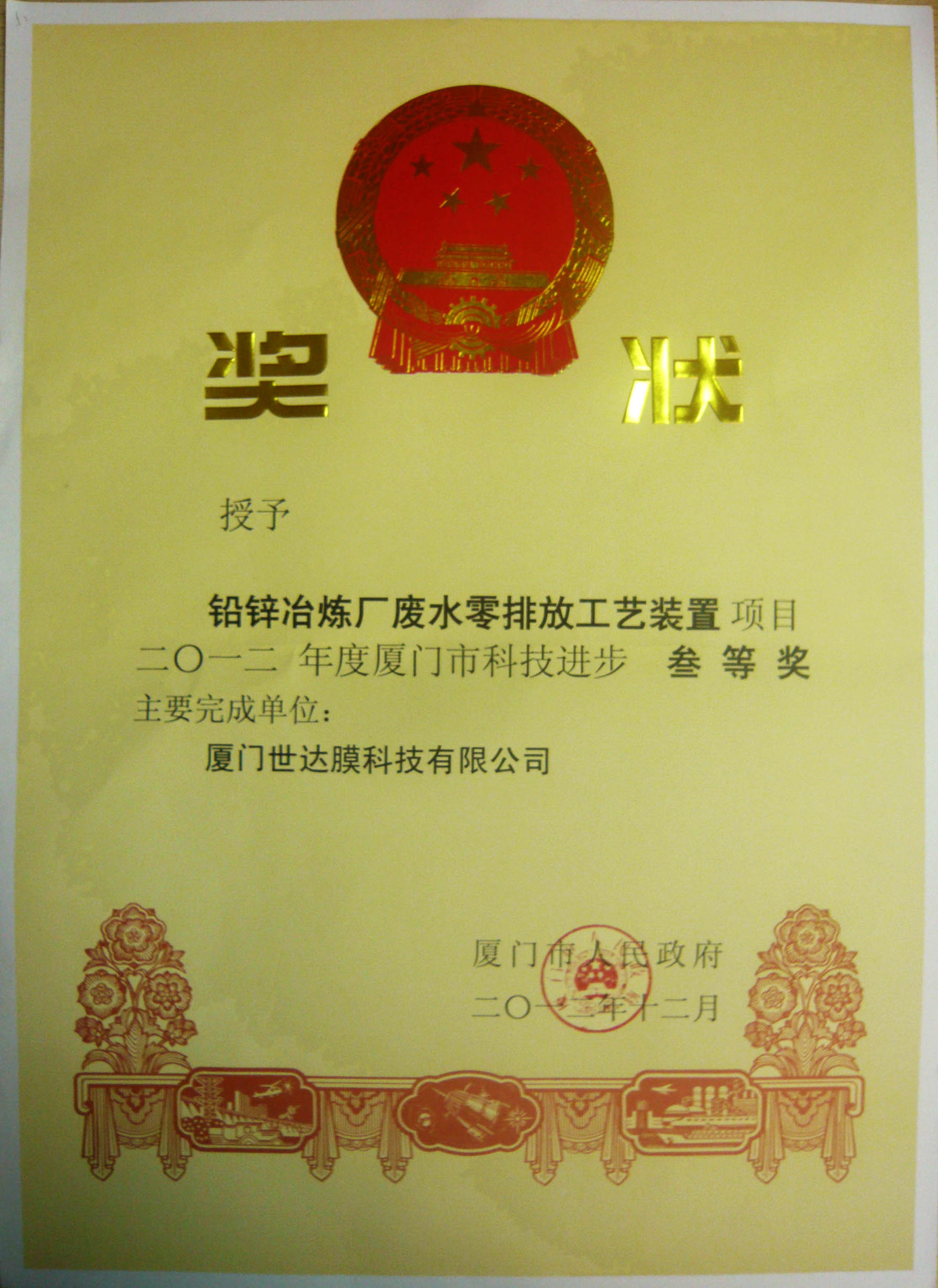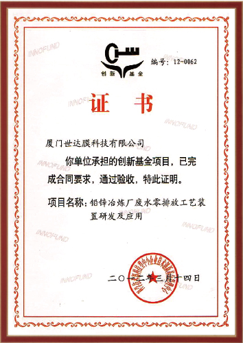 2009年:自主研发项目“铅锌冶炼厂废水零排放工艺装置”被录入科技成果登记,且已建成国内首条铅锌行业零排放膜法系统,并于2012年12月获评厦门市科技进步三等奖;